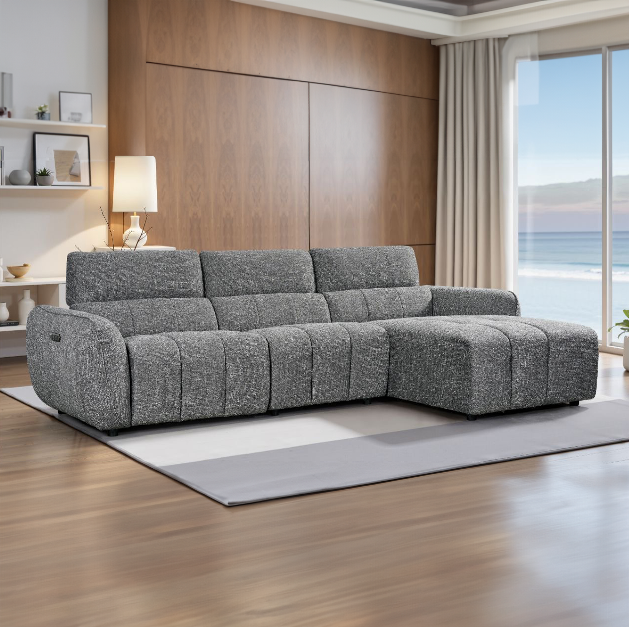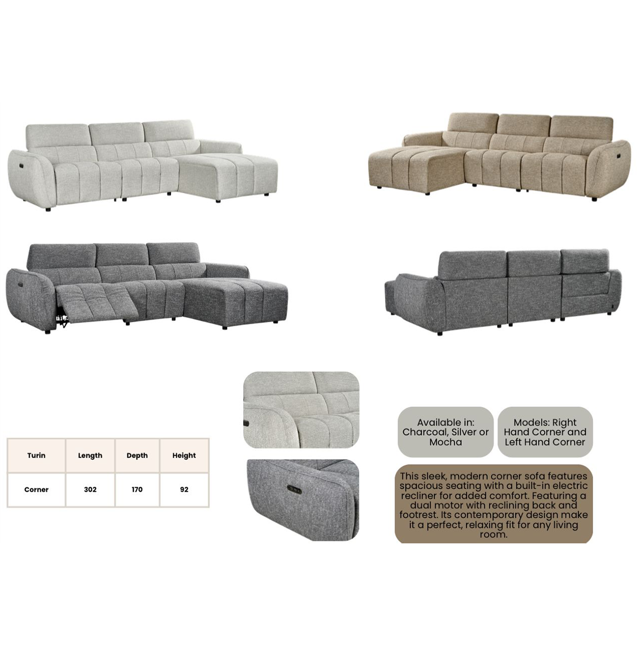 This sleek, modern corner sofa features spacious seating with a built-in electric recliner for added comfort. Featuring a dual motor with reclining back and footrest. Its contemporary design make it a perfect, relaxing fit for any living room.