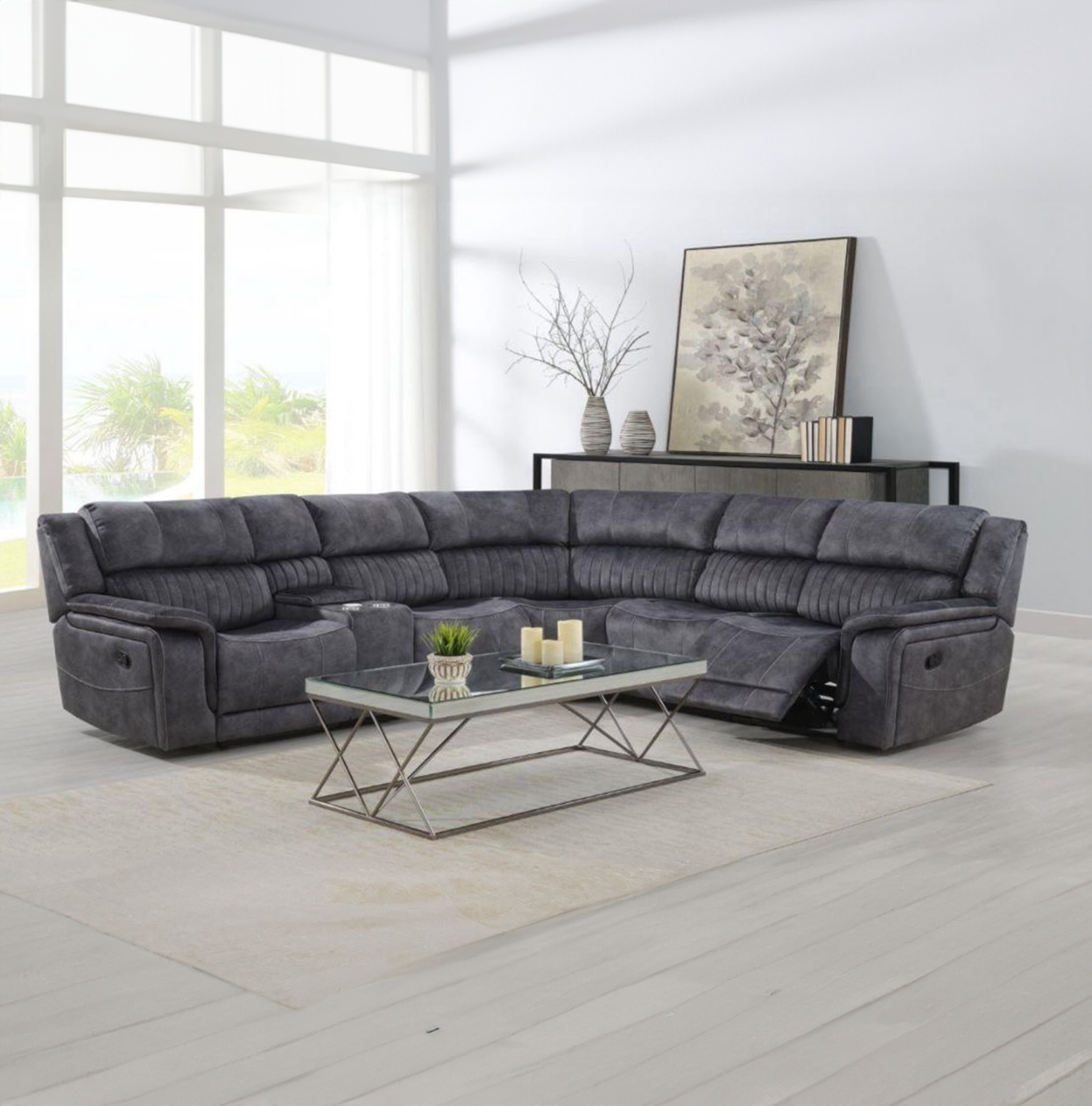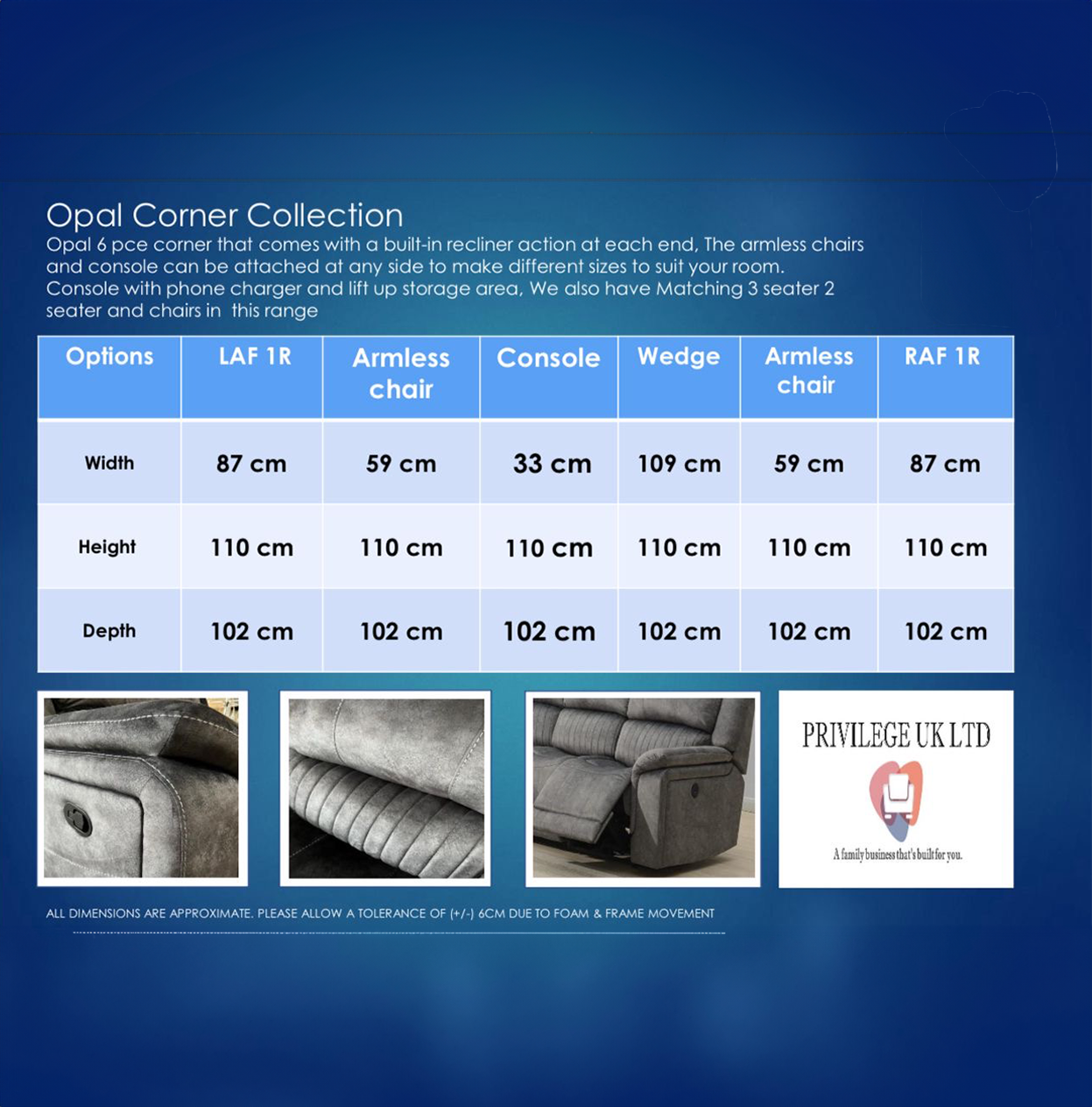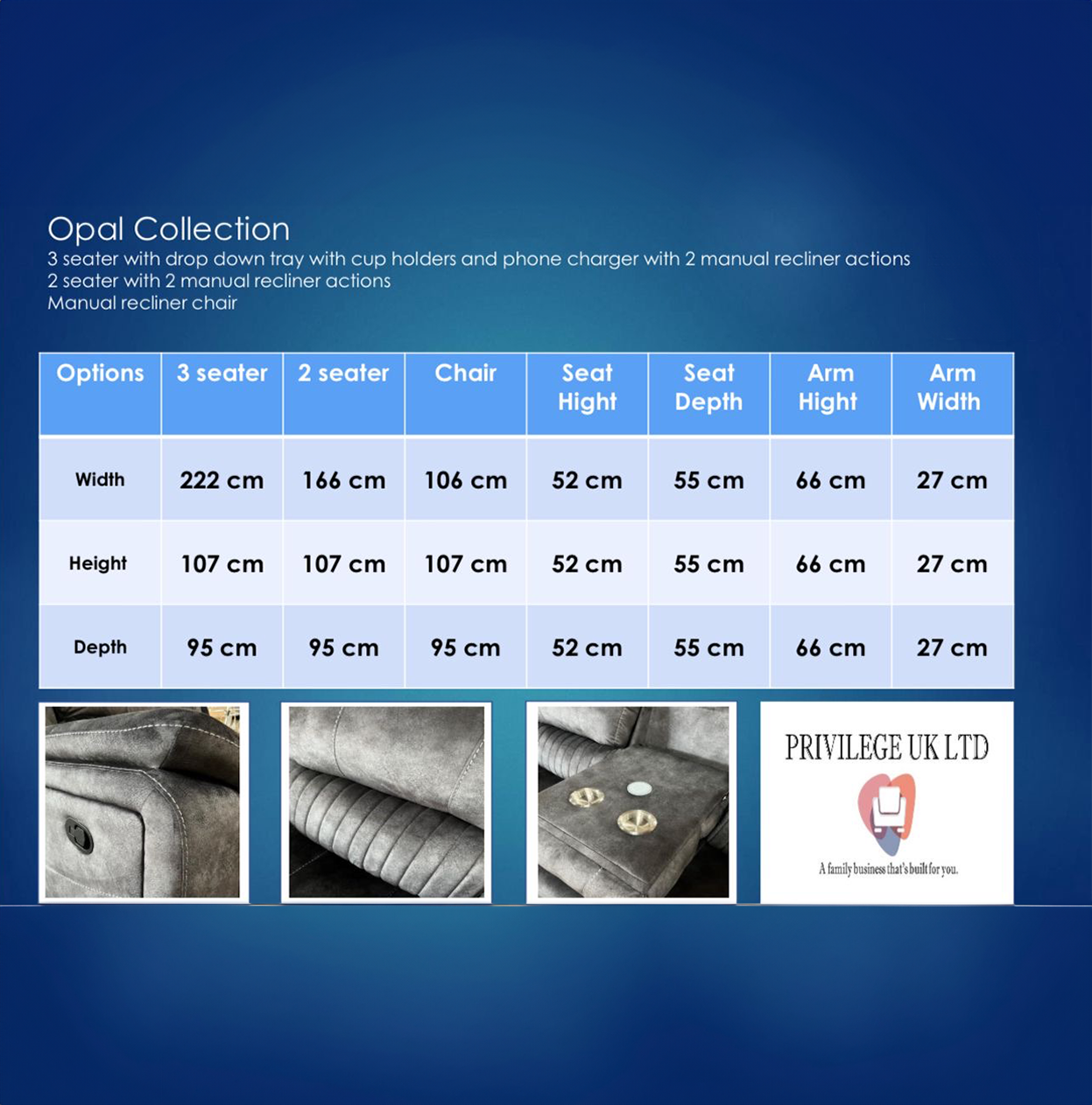 The Opal model is a manual recliner, the corner has a console unit with storage and drinks holder with mobile charging, this model is upholstered in a luxurious grey fabric and looks great in any environment.