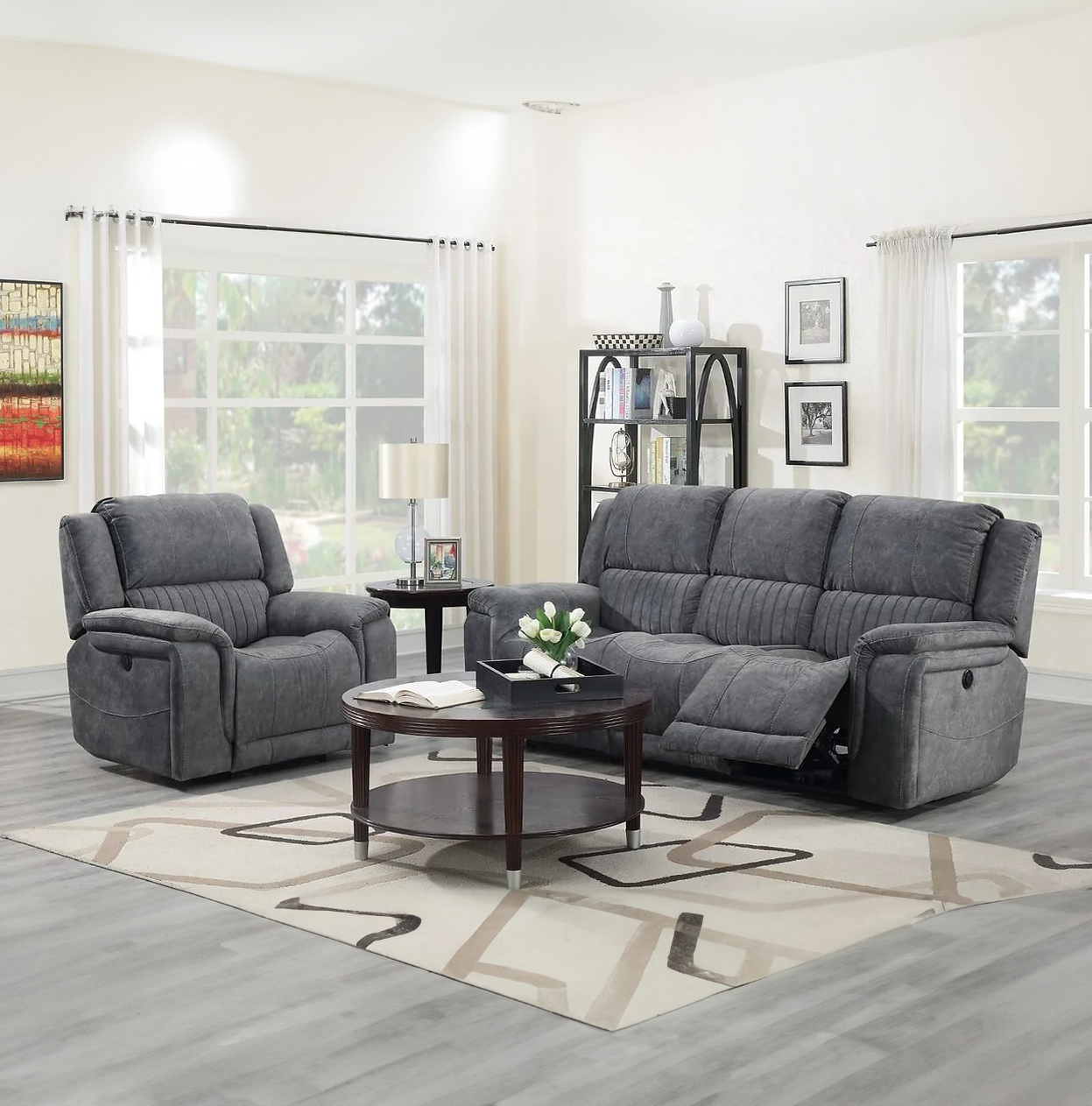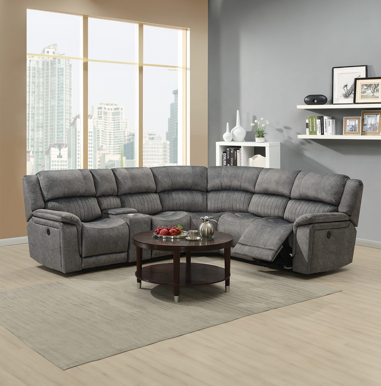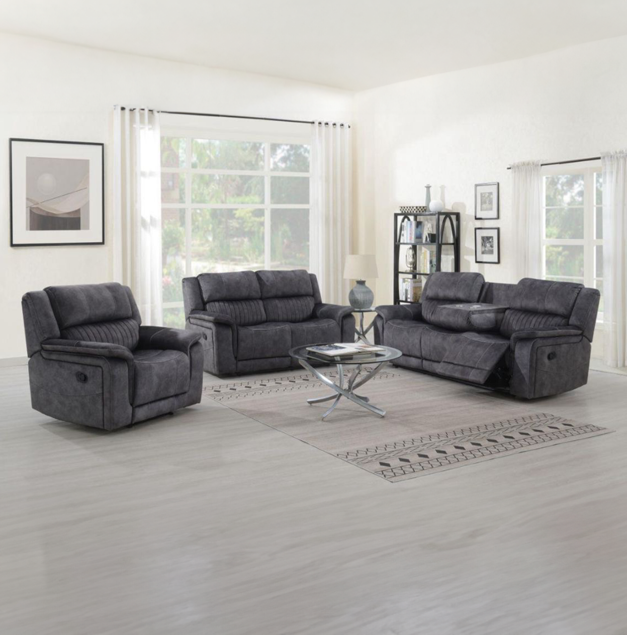 The Opal model is a manual recliner, the corner has a console unit with storage and drinks holder with mobile charging, this model is upholstered in a luxurious grey fabric and looks great in any environment.