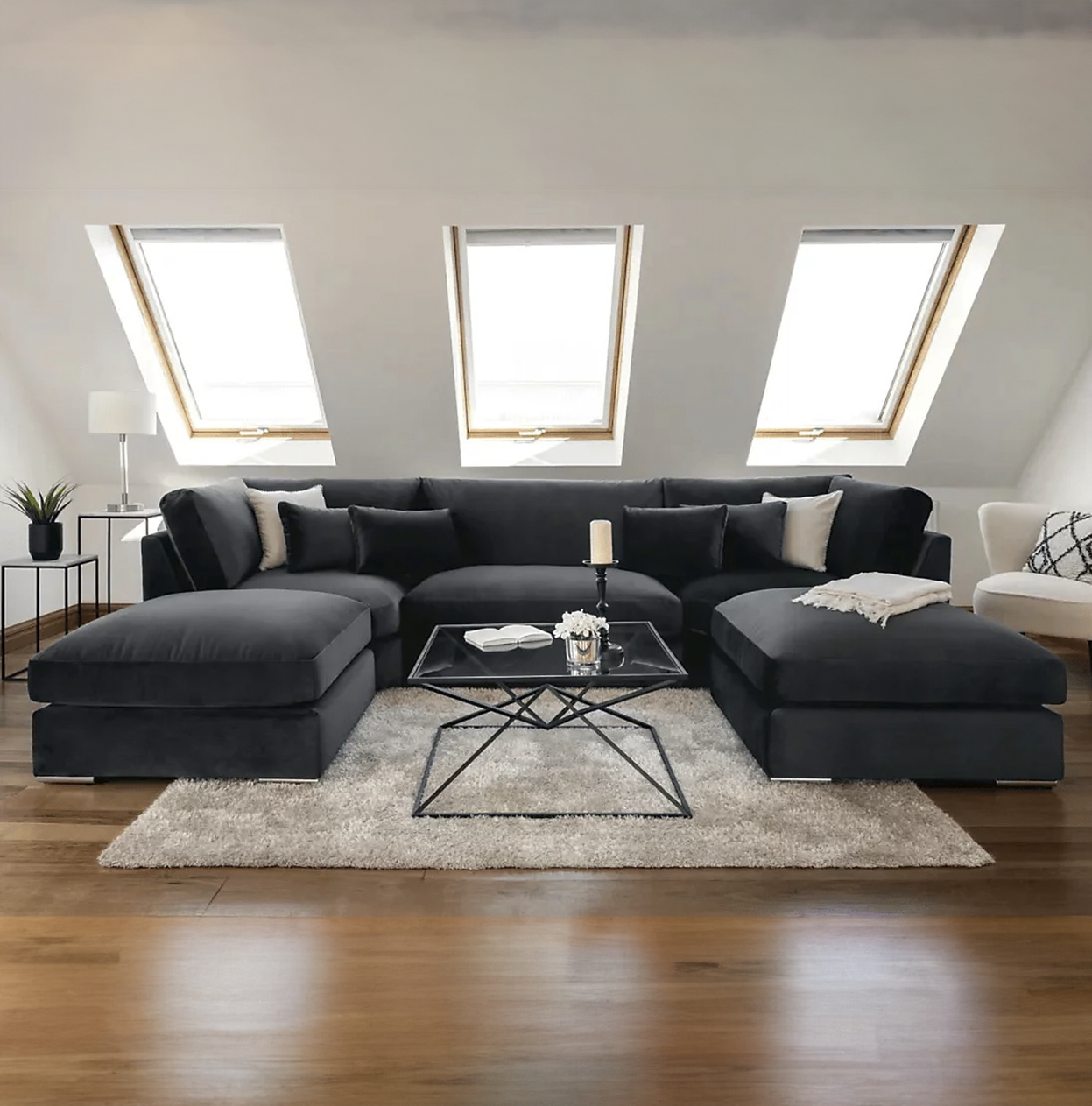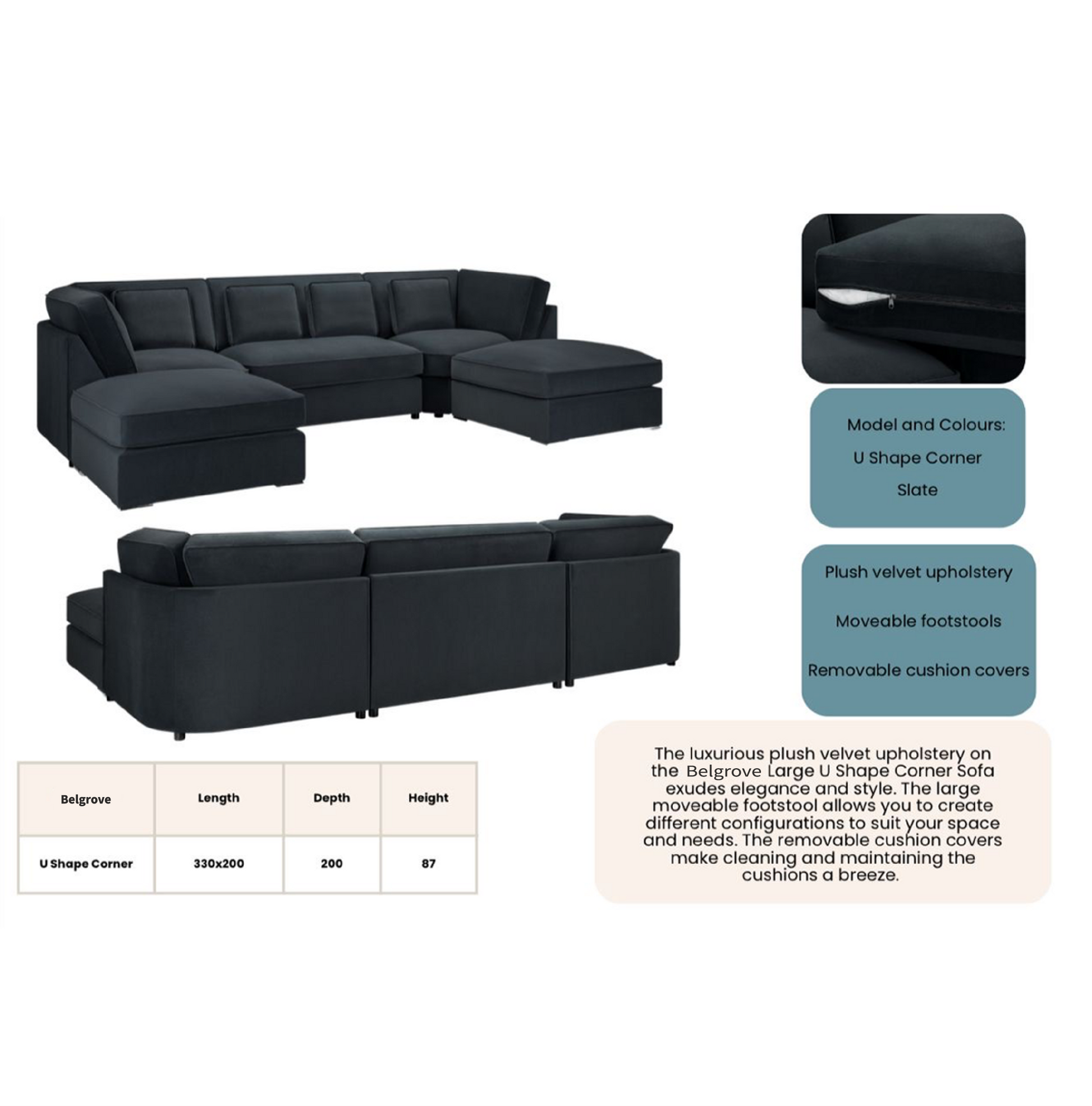 The luxurious plush velvet upholstery on the Belgrove Large U Shape Corner Sofa exudes elegance and style. The large moveable footstool allows you to create different contigurations to suit your space and needs. The removable cushion covers make cleaning and maintaining the cushions a breeze.