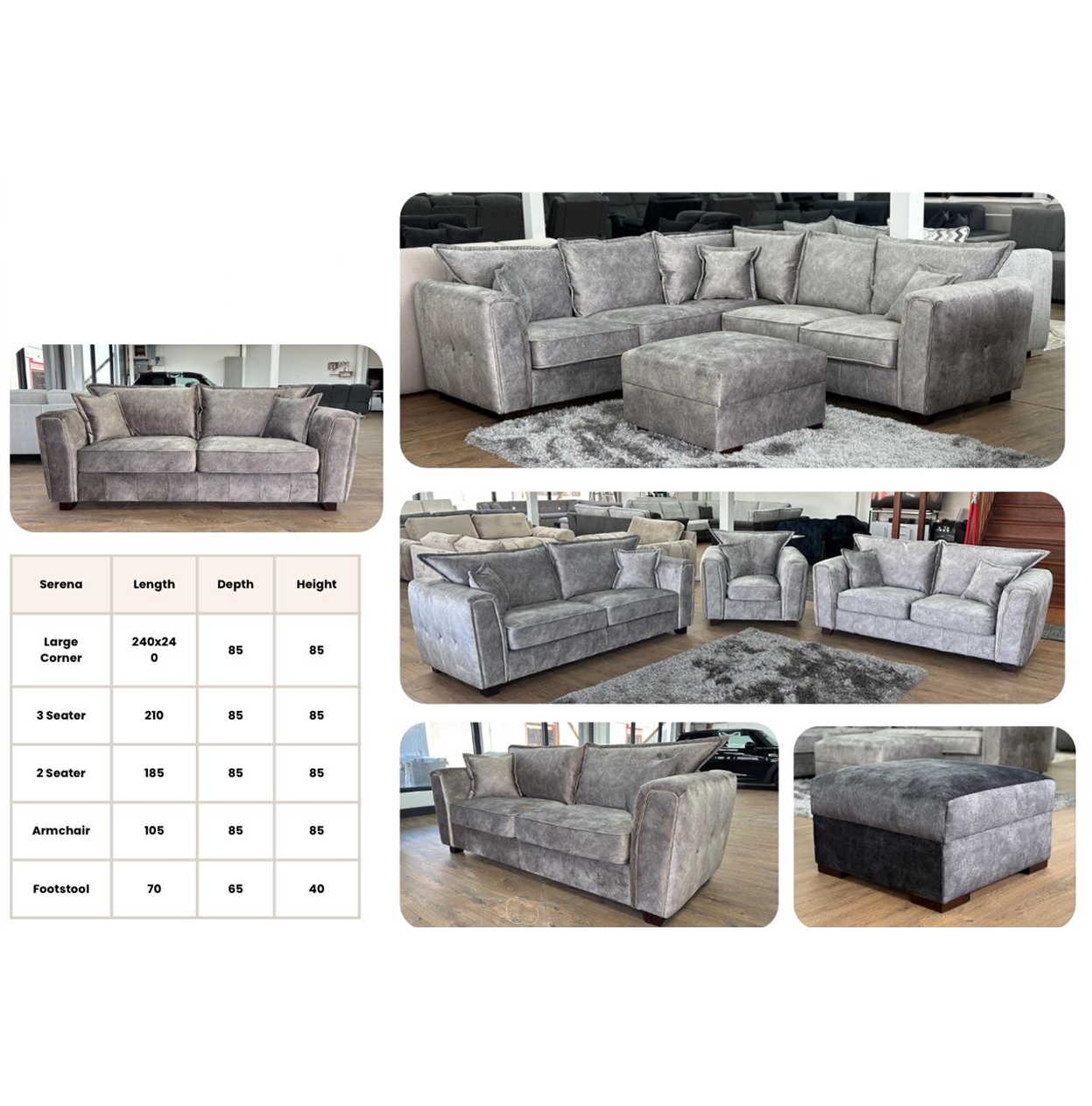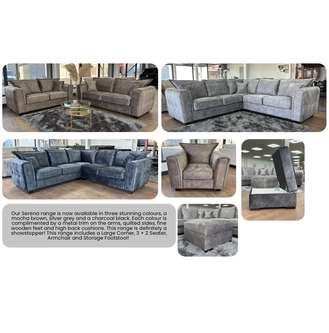 Our Serena range is now available in three stunning colours, a mocha brown, silver grey and a charcoal black. Each colour is complimented by a metal trim on the arms, quilted sides, fine wooden feet and high back cushions. This range is definitely a showstopper! This range includes a Large Corner, 3 + 2 Seater, Armchair and Storage Footstool!