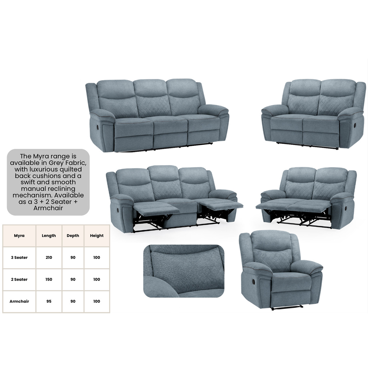 The Myra range is available in Grey Fabric, with luxurious quilted back cushions and a swift and smooth manual reclining mechanism. Available as a 3 & 2 Seater + Armchair